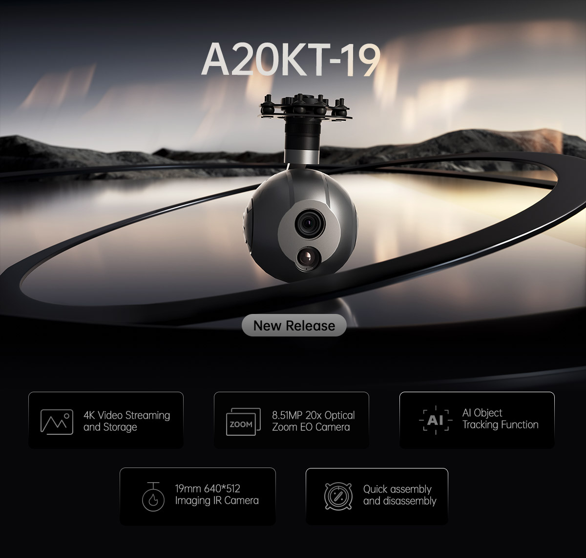 The A20KT-19 is a 3-axis 4K Ultra-High Definition dual-sensor AI Object Tracking Gimbal Camera. It is equipped with multiple sensors: an 8.51MP imaging sensor with 20x optical zoom, and a 640×512 thermal imaging sensor with a 19mm focal length.