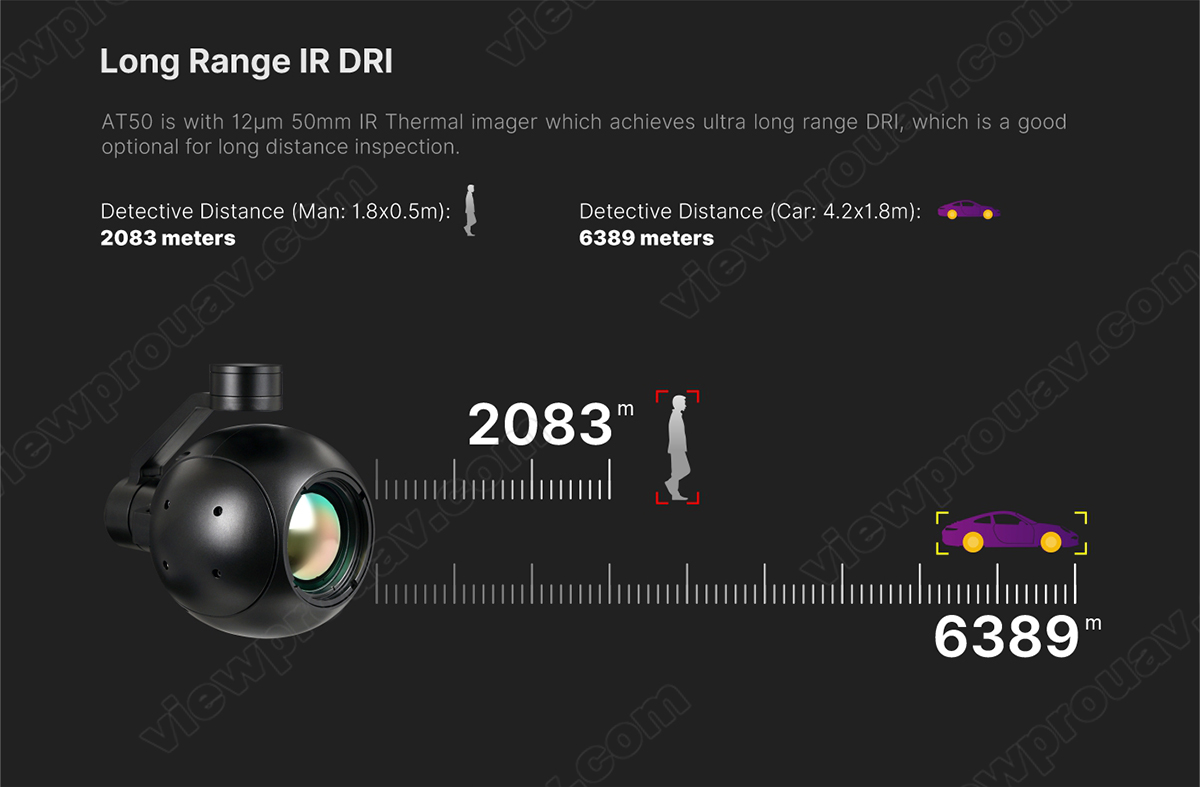 AT50 is 3-axis stabilized gimbal camera which is made by aluminium with stronger anti-interference performance. With 50mm 12μm 640*512 Pixel IR thermal sensor, the IR detect range is up to 6000m. Moreover, AT50 is with the feature of AI autonomous tracking which will increase the tracking efficiency. Thermometry / radiometric version as optional supports to show the highest, lowest and center temperature of the real-time video stream on the screen.
