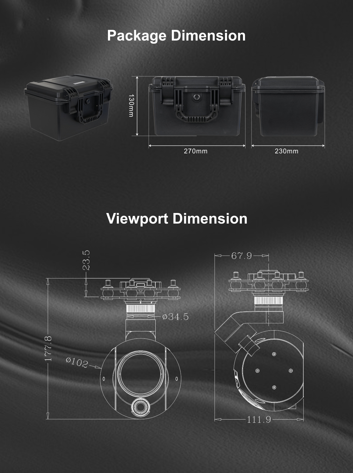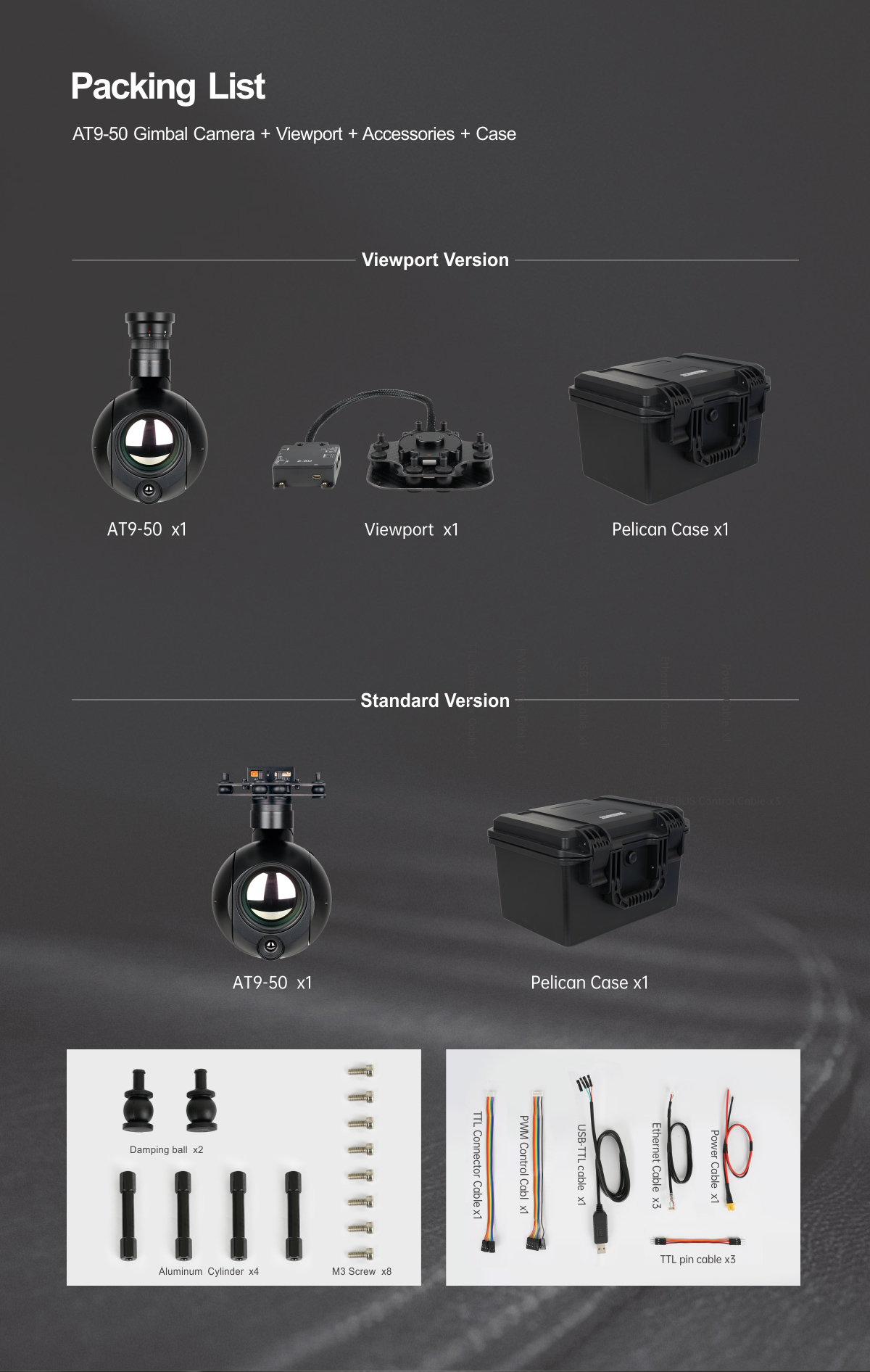 | Accessories | 1pc gimbal camera device, screws, aluminum cylinders, damping balls, damping boards, 1pc USB to TTL cable / Hight quality plastic box with foam cushion |