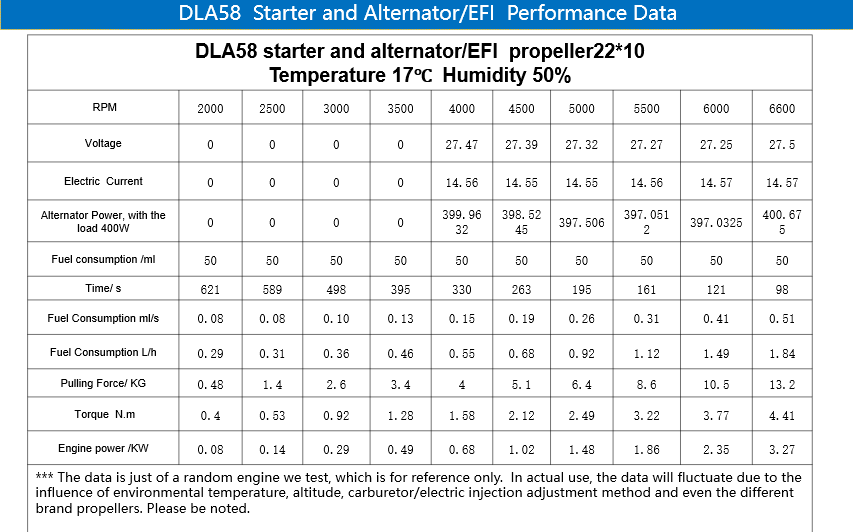 DLA58 EFI motoru (DLE58UAE), maksimum kalkış ağırlığı (benzin dahil) 18 kg olan sabit kanatlı İHA'lar için idealdir.