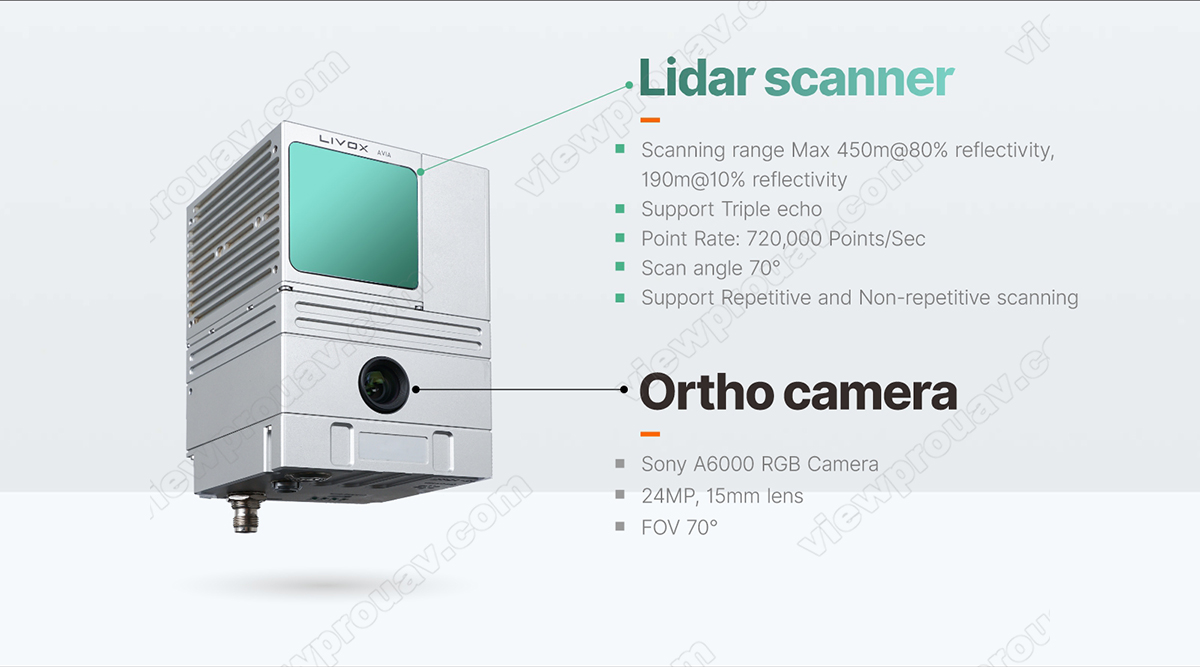 Features with light-weight (only **1.05kg**), fast data processing speed, it can be integrated with various multicopter to quick obtain the 3D position and attribute information of the object in the mission area. Through the data processing software, it will generate the digital image such as **DEM, DOM (Sony A6000 24MP surveying camera), DSM, DRG, DLG**. Which can be widely used in the **Digital city construction**, **river and soil research**, **Land survey**, **Forestry and Agriculture analysis**.