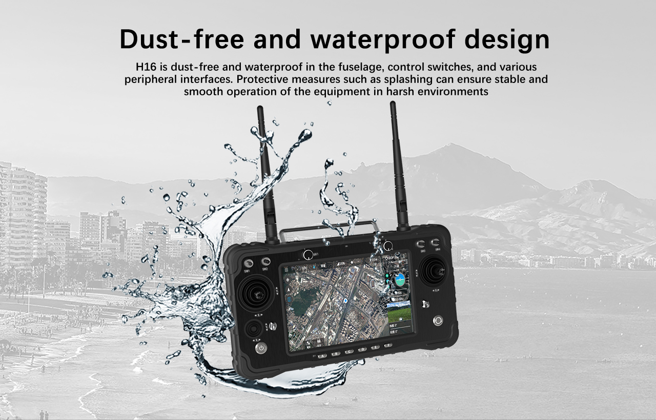 Whether you’re piloting drones, robots, or industrial control equipment, the H16 Pro promises unparalleled performance. Its diverse range of interfaces, including **HDMI**, **RJ45**, and sensor interfaces, makes it versatile for various applications, from aerial photography to border defense. With **IP67 grade protection**, it’s designed to withstand challenging environments, ensuring durability and reliability. The H16 Pro is not just a remote control; it’s a revolution in drone communication.
