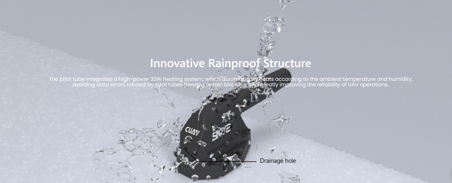 The **CUAV SKYE 2 DroneCAN Airspeed Sensor** is an industry-first, highly integrated solution for UAVs. It combines a **pitot tube, airspeed sensor (MS5525), temperature and humidity sensor, ARM M4 processor (STM32F4), and a dual temperature control system** into a single, compact unit. With its **intelligent de-icing, rainproof design, and DroneCAN protocol support**, it ensures accurate and reliable airspeed measurement in challenging weather.