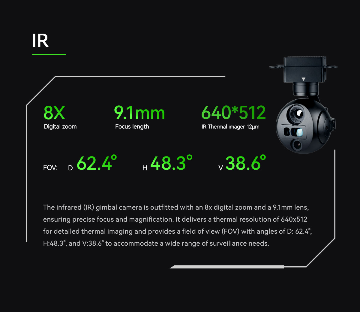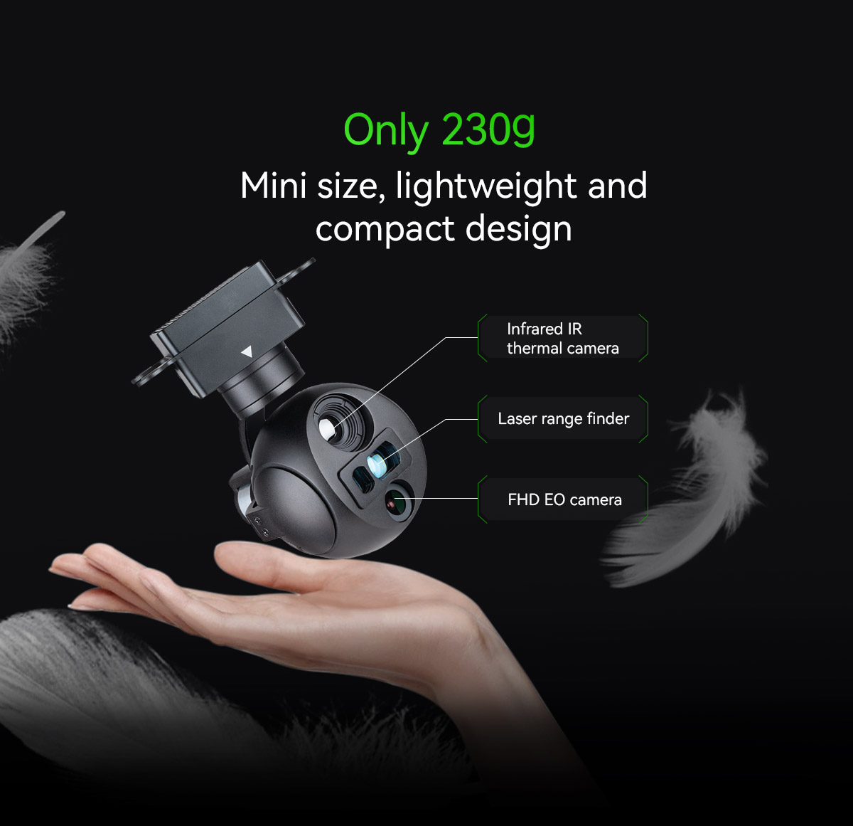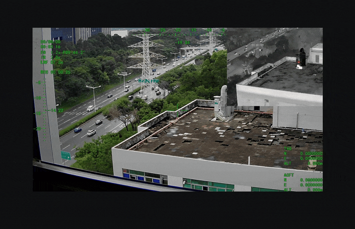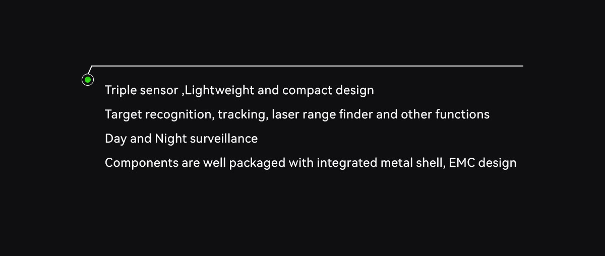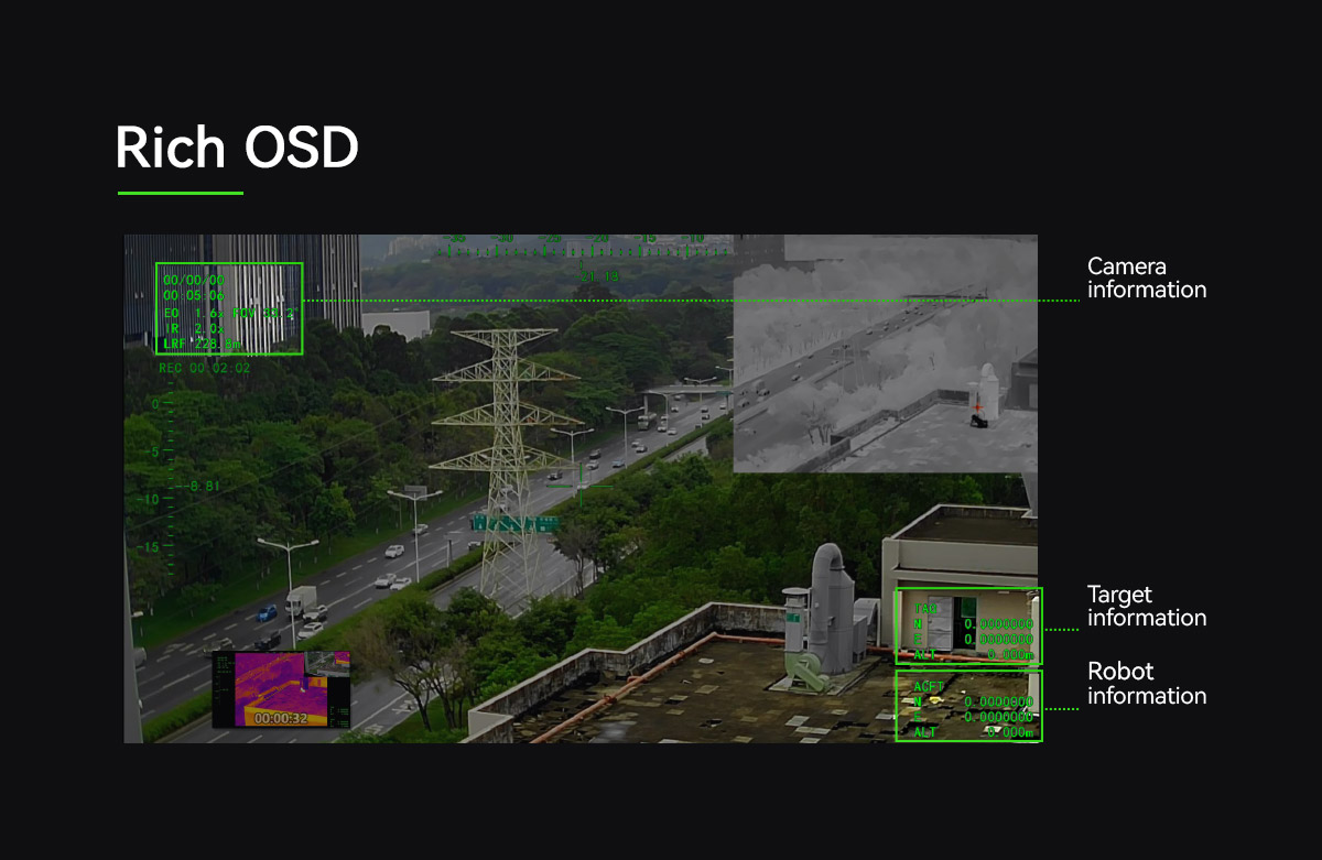 | Ekran Görüntüsü (OSD) | Gimbalin sapma ve eğilme açısını, büyütme oranını, mesafe ölçüm değerini, kart kayıt süresini, hava aracının GPS ve irtifasını, hedef mesafe noktası GPS ve irtifasını, tarih ve saati gösterir |