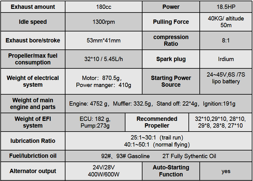 DLA 180cc EFI İHA Motoru, büyük sabit kanatlı ve VTOL drone'lar için tasarlanmıştır. Artık marş motoru ve alternatörün EFI versiyonu ile donatılmıştır. EFI motoru, daha yüksek güç, yakıt verimliliği, düşük gürültü, stop etmeye daha az eğilimli olma ve yalnızca tek bir ateşleme gerektirme gibi birçok açıdan daha gelişmiştir. ECU (Motor Kontrol Ünitesi), motor sıcaklığına ve irtifaya göre ateşleme zamanlamasını, yakıt enjeksiyon miktarını ve rölanti kontrolünü otomatik olarak ayarlayabilir.