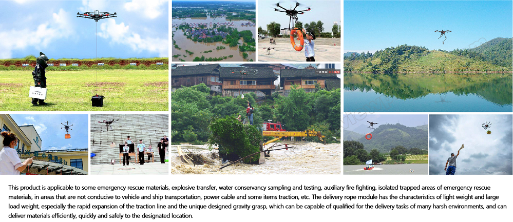 Acil durum kurtarma ve havadan malzeme teslimatı için uygun bir hava halat sistemi. Yüksek mukavemetli tasarım, küçük hacim, hafif yapı ve üstün dayanıklılık özelliklerine sahiptir. Kamu güvenliği, itfaiye, enerji hatlarında çalışma, malzeme taşıma, izole bölgelere yardım malzemesi ulaştırma gibi alanlarda kullanılabilir.